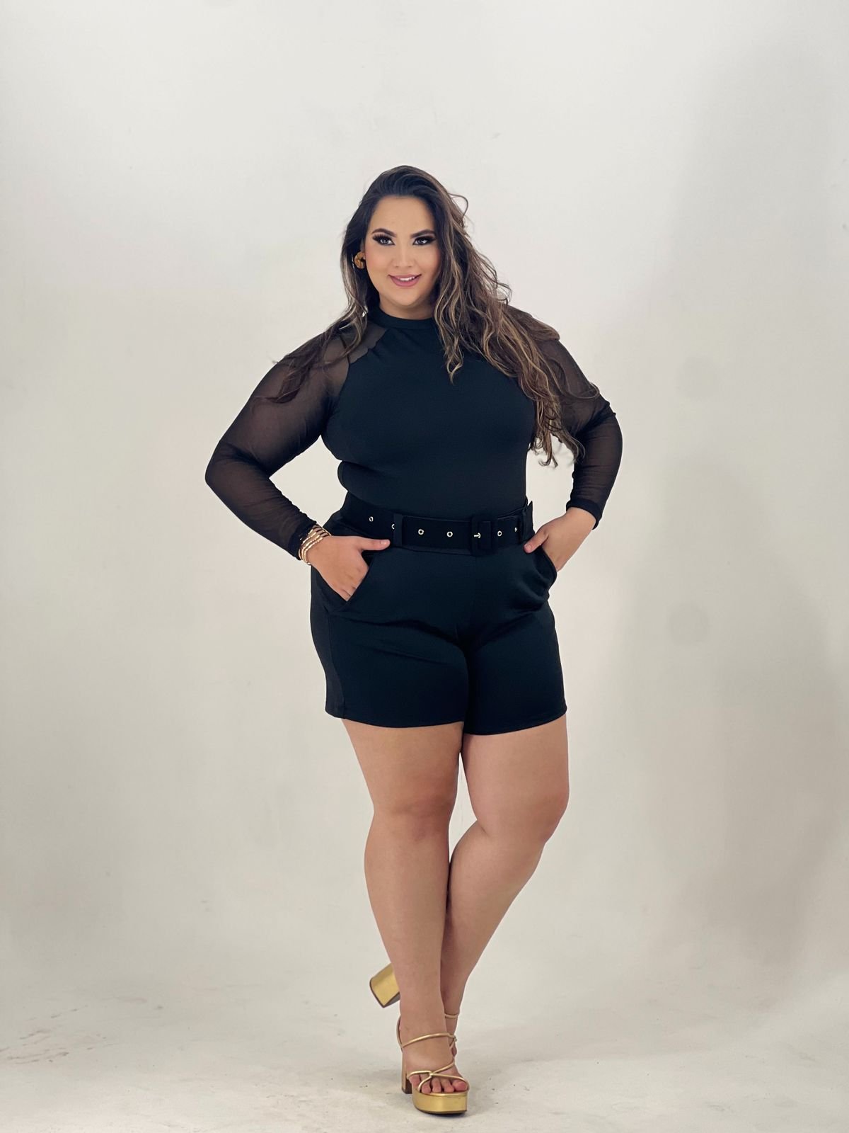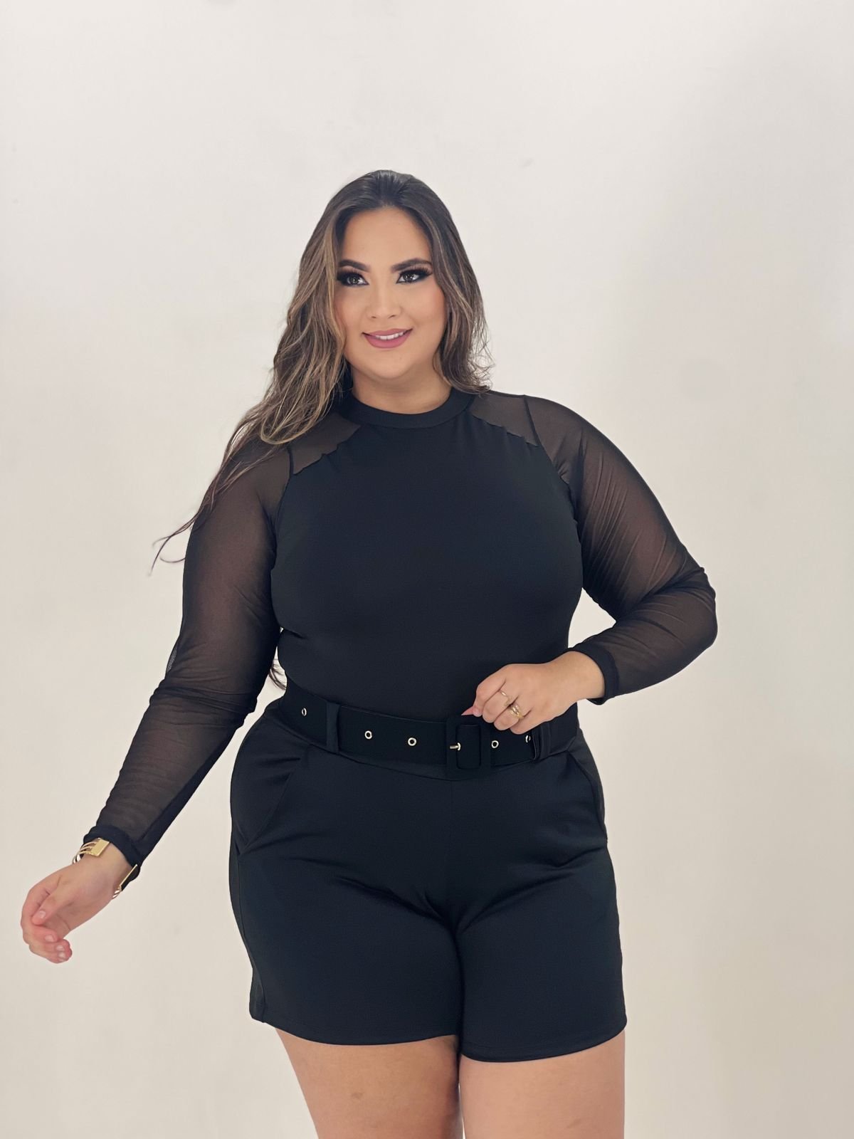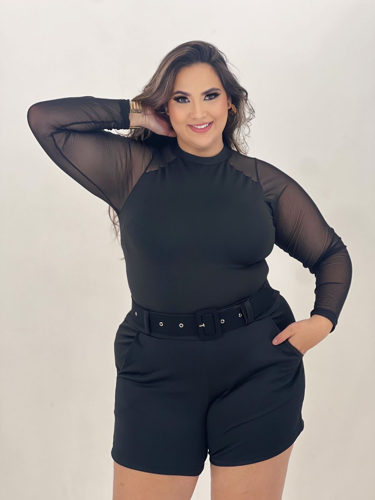 Bory de malha suplex com mangas de tule, somente no preto, veste do 44 ao 48.
