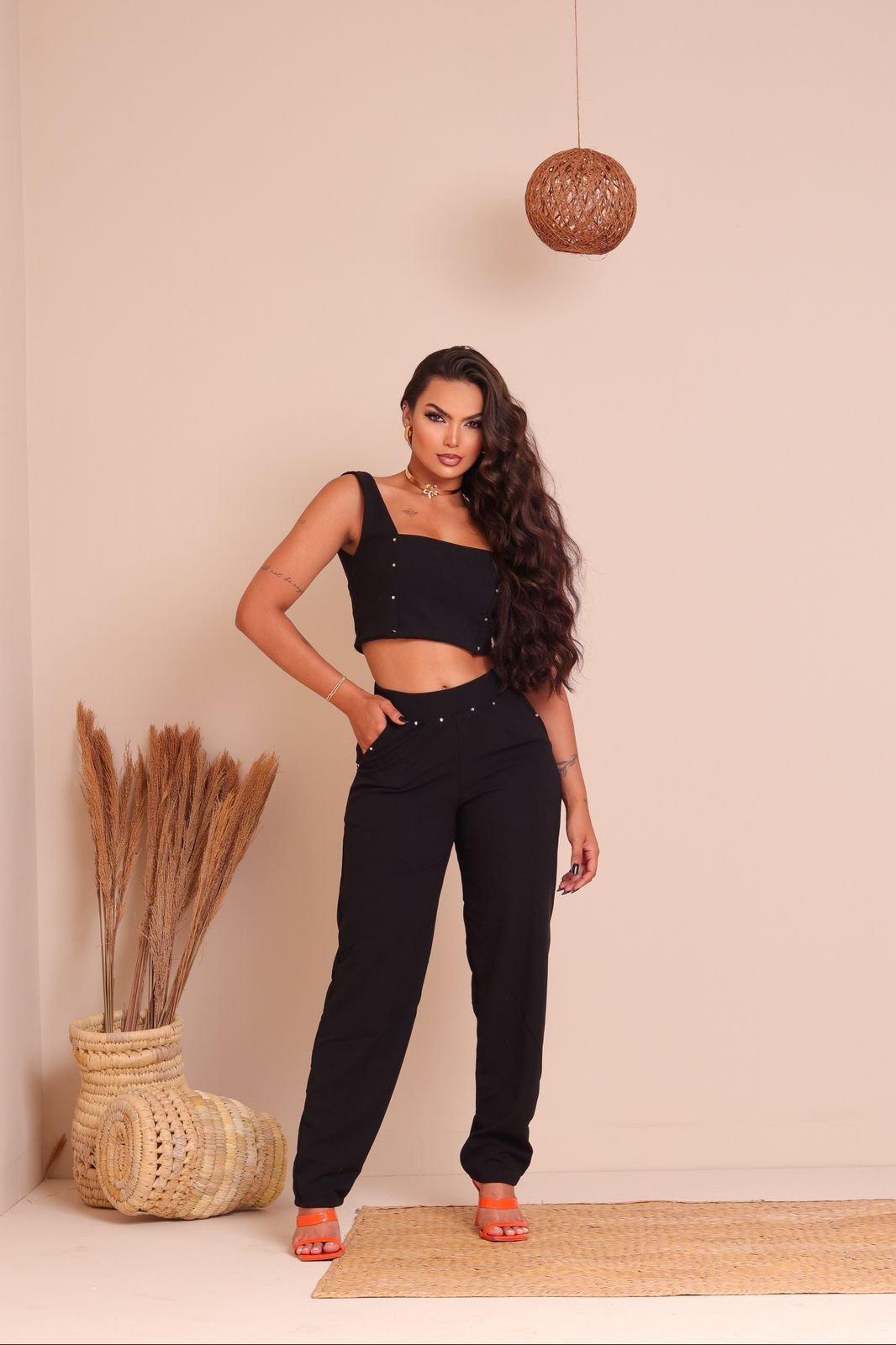 Em malha scuba crepe, disponível em 4 cores, veste somente M, aplicações de olho de peixe (brilho).