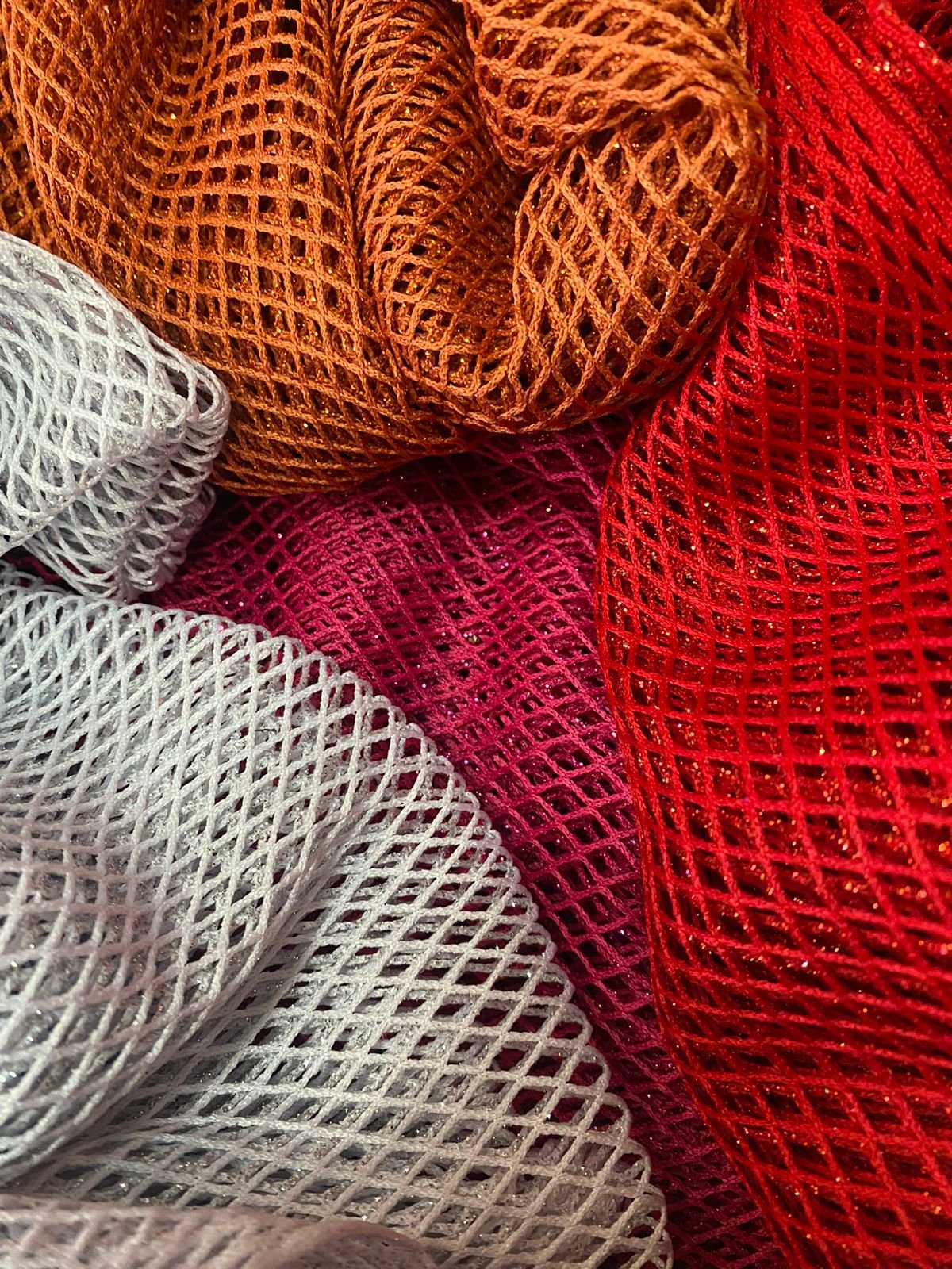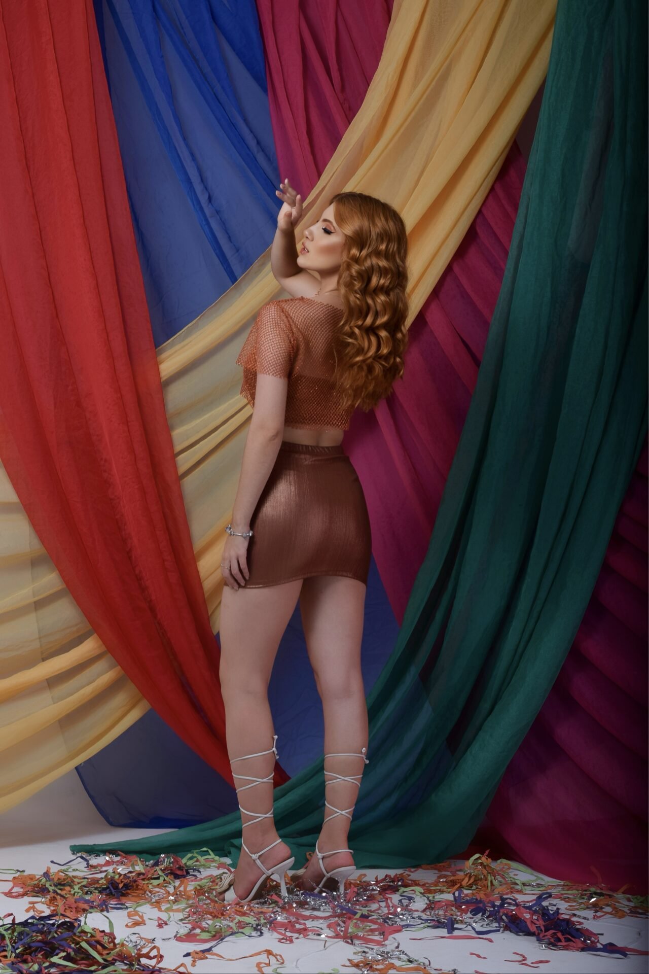 Conjunto trio: cropped de arrastão, top com bojo e saia de malha metalizada, combinando as cores.