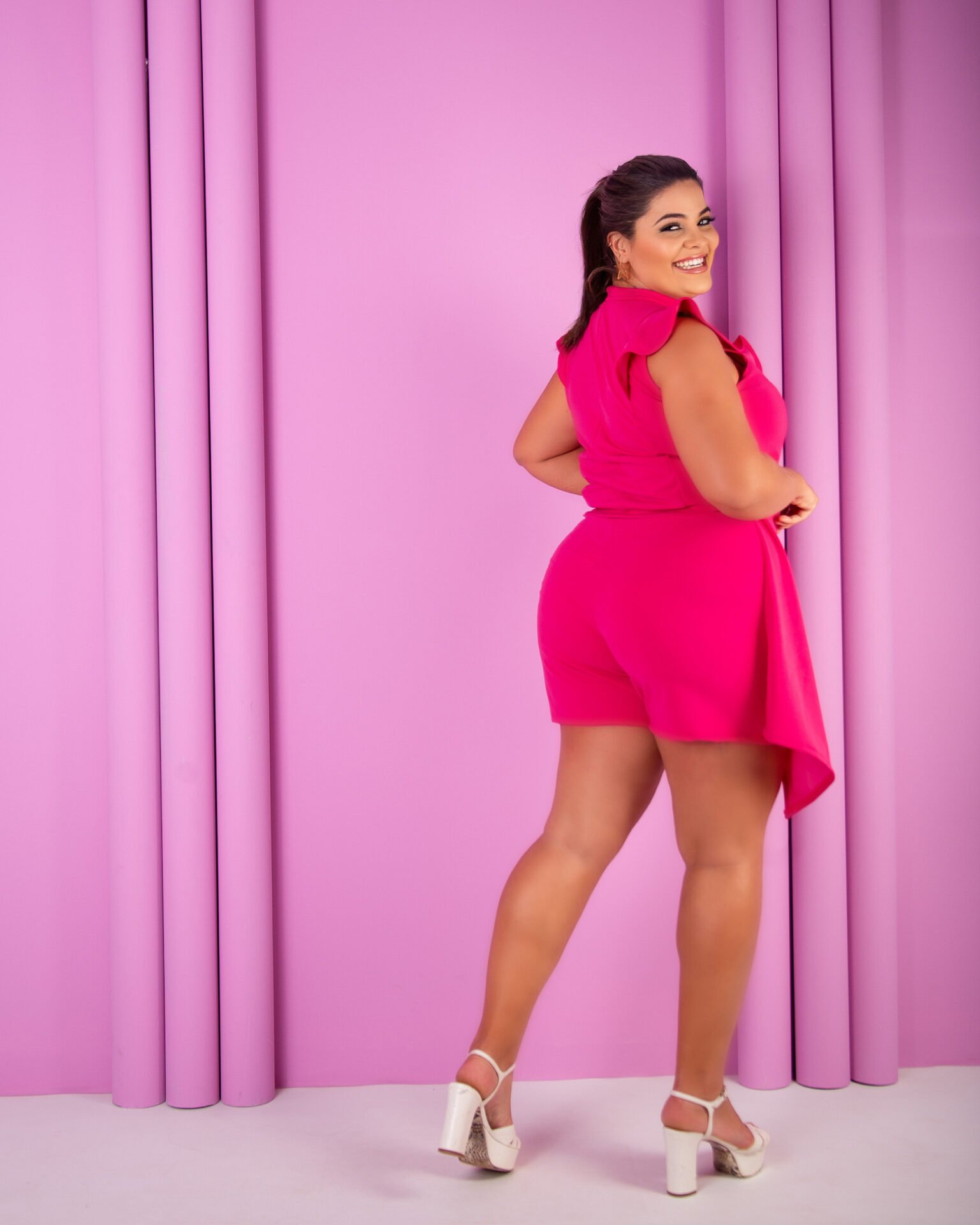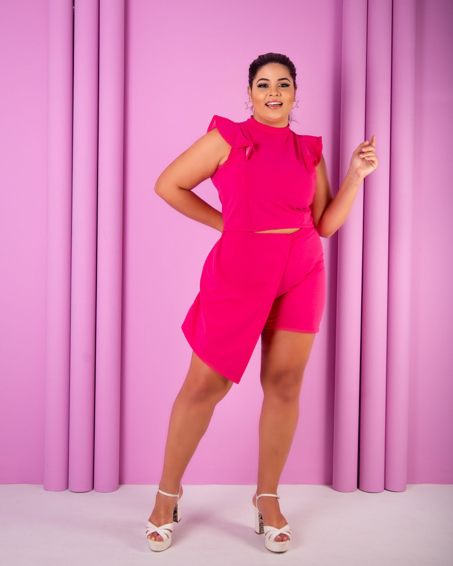 Malha scuba crepe, cropped com babados e short saia com detalhe, veste do 44 ao 48. Em 4 cores disponíveis.