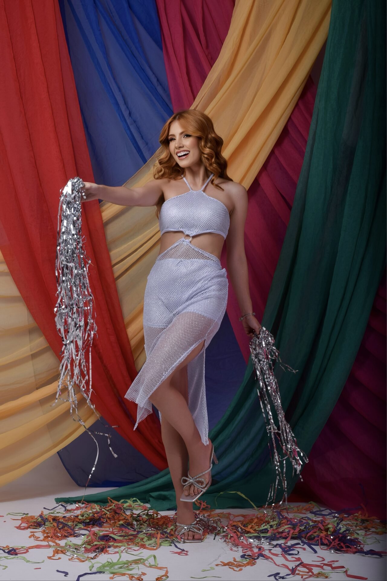 Vestido de arrastão com brilho, short solto de malha metalizada , detalhe de argola, em 4 cores.